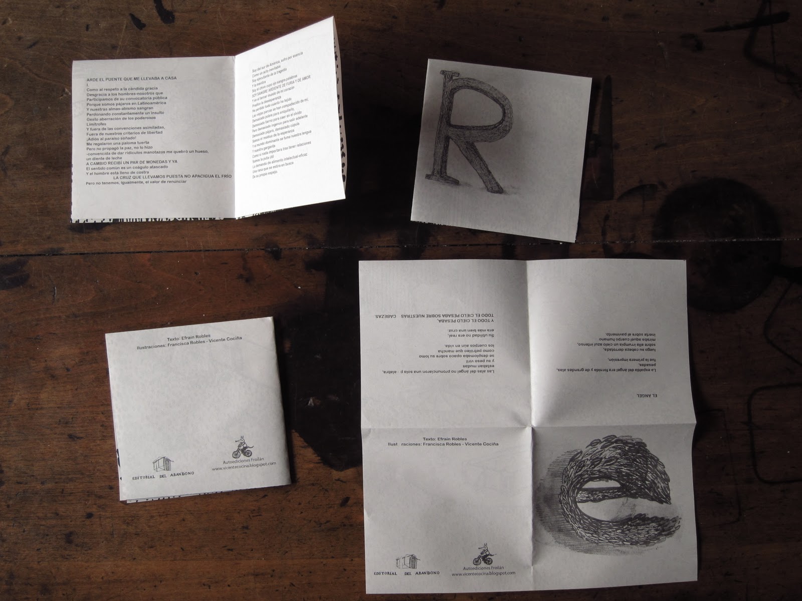 Arde el puente que me llevaba a casa es la tercera publicación de Autoediciones Froilán (en esta ocación junto a Editorial el Abandono). Con textos de Efraín Robles e ilustraciones de Francisca Robles y Vicente Cociña, impreso en serigrafía e impresora casera.