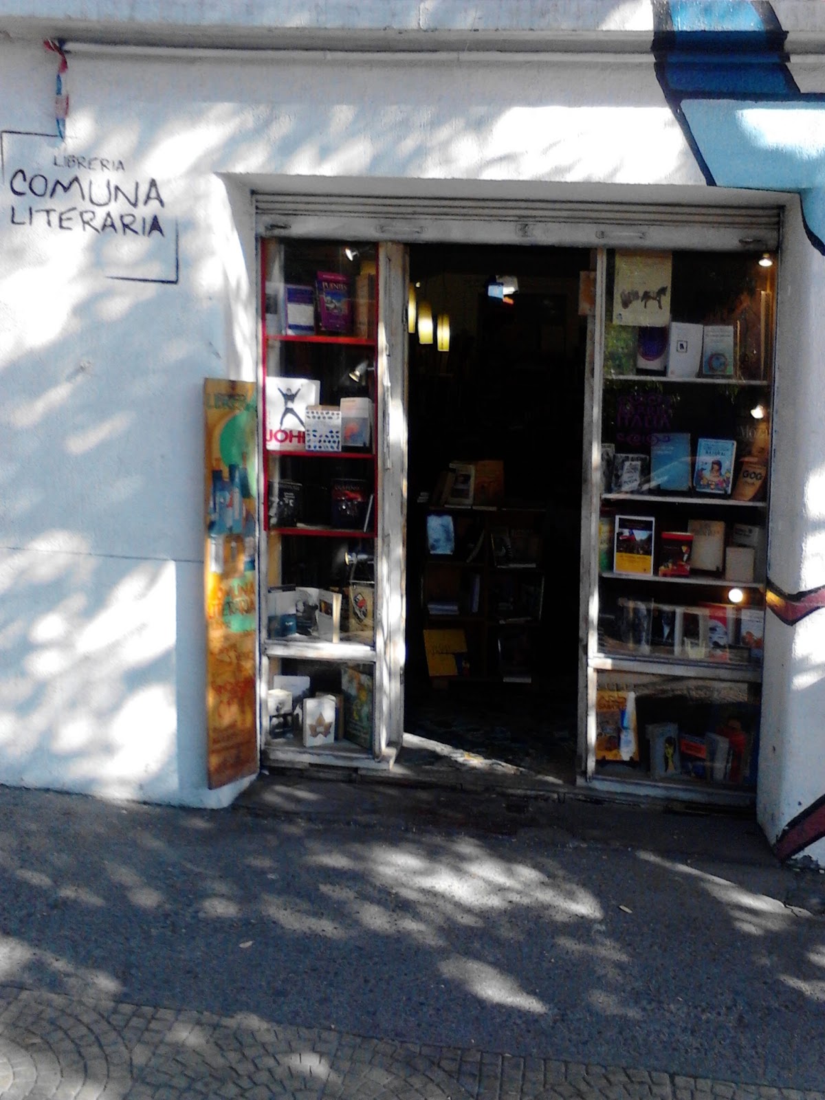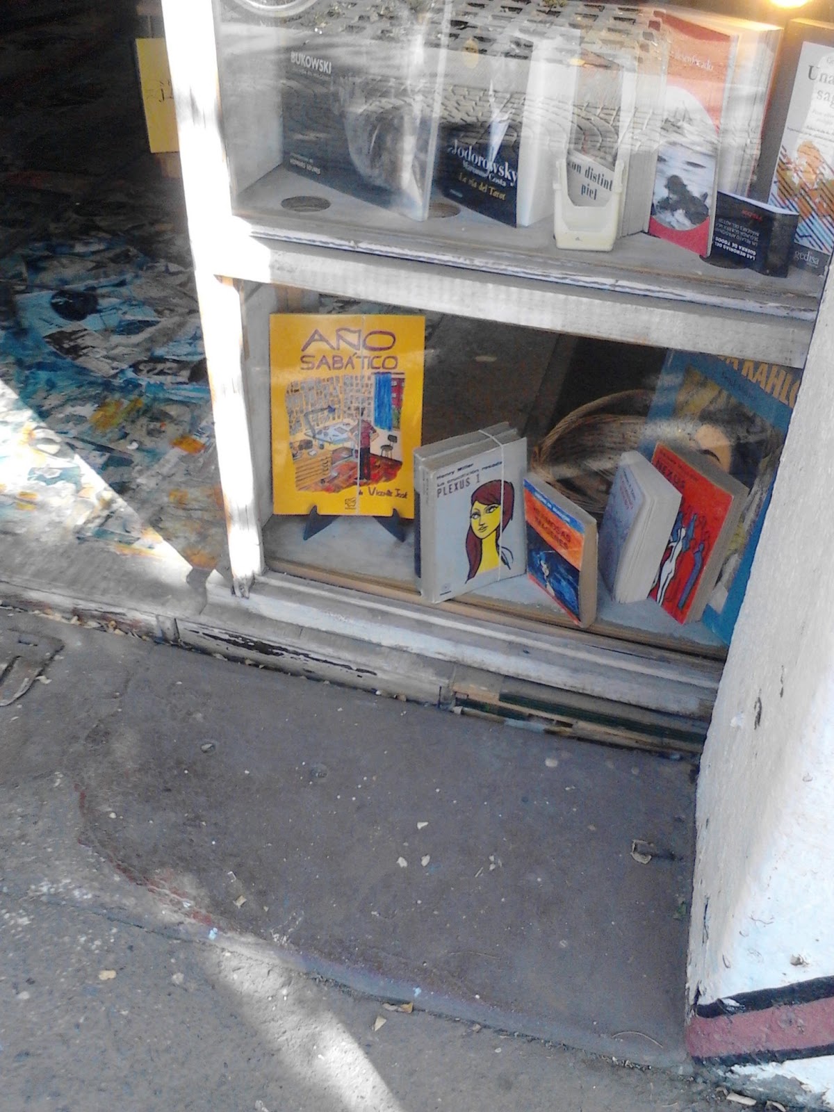 El libro Año Sabático en la vitrina de la Librería Comuna Literaria, en “El Sofá” en la calle Santa Isabel (entre Seminario y Bustamante).
